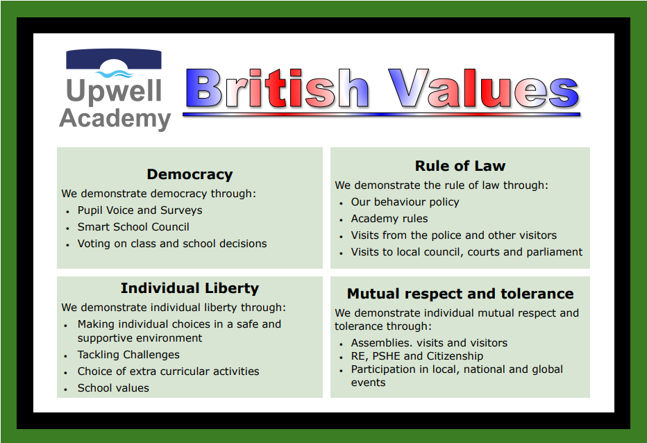 At Upwell Academy, we help prepare our pupils to live confidently and respectfully in modern Britain. We proudly promote the five British Values, as defined by the Department for Education: